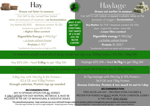 A horse needs 1.5%-3.5% of its body weight in DM depending on the individual’s needs – breeding, heavy work, poor condition, hard keeper etc. You would need to feed 11.8kg of Hay and 16.7kg of Haylage (for the purpose of this exercise hay or haylage is the only forage being consumed) to achieve 2% DM suitable for the average 500kg horse at maintenance with a good weight. Whilst haylage has lower DM, it has higher Digestible Energy (DE) and protein (CP) which is not suitable for many equines especially easy keepers, metabolic and/or laminitic prone, digestive issues such as ulcers, loose manure, and especially behavior related issues. If you have horses that would benefit from the extra protein and calories that haylage offers, it would be a good practice to do 50/50 hay and haylage, which would help to balance the DE, CP and DM intake.