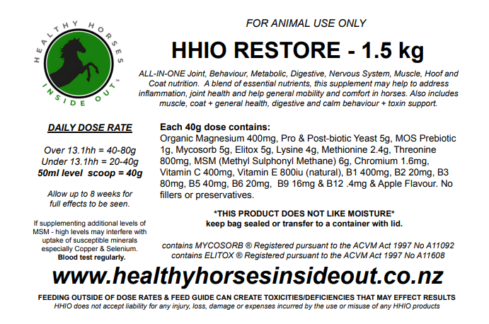 ★★★★★New RestoreI have had my Kaimanawa on the Restore New formula for over a month now and it has made fantastic changes. He was starting to show Insulin Resistance signs, so I was pleased to see this supplement mix come out with the Chromium and Lysine etc for metabolic issues along with the MSM for his older joints etc. He has dropped weight, turning back to his muscle little self. He has his energy back and overall is much happier in himself. Wow the weight loss/body condition alone is awesome but to see him running bucking and having fun is the icing on the cake. I've already ordered the next lot and I highly recommend you do too.
